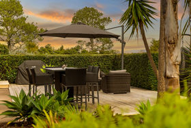 Outdoors, the property is fully fenced with an electric gate. The grounds have established gardens, a BBQ area, and a spa pool for relaxation and stargazing.